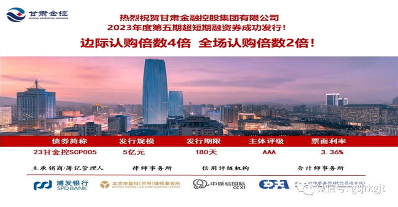 2023年12月14日,甘肅金控集團(tuán)成功發(fā)行2023年度第五期超短期融資券,發(fā)行規(guī)模5億元,債券期限180天,票面利率3.36%。本次債券發(fā)行獲得了銀行、券商、公募基金等金融機(jī)構(gòu)的踴躍認(rèn)購,邊際認(rèn)購倍數(shù)4倍,全場認(rèn)購倍數(shù)2倍。