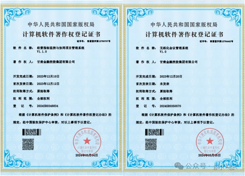 近日,甘肅金控集團(tuán)獲得“無紙化會議管理系統(tǒng)”、“客戶管理平臺”、“經(jīng)營指標(biāo)監(jiān)控與協(xié)同項(xiàng)目管理系統(tǒng)”和“發(fā)展黨員管理系統(tǒng)”四項(xiàng)計(jì)算機(jī)軟件著作權(quán)登記證書。本次獲得證書的軟件系統(tǒng)是集團(tuán)在行政辦公、經(jīng)營管理和黨建信息化建設(shè)方面的最新成果,標(biāo)志著集團(tuán)信息技術(shù)能力邁上新臺階。