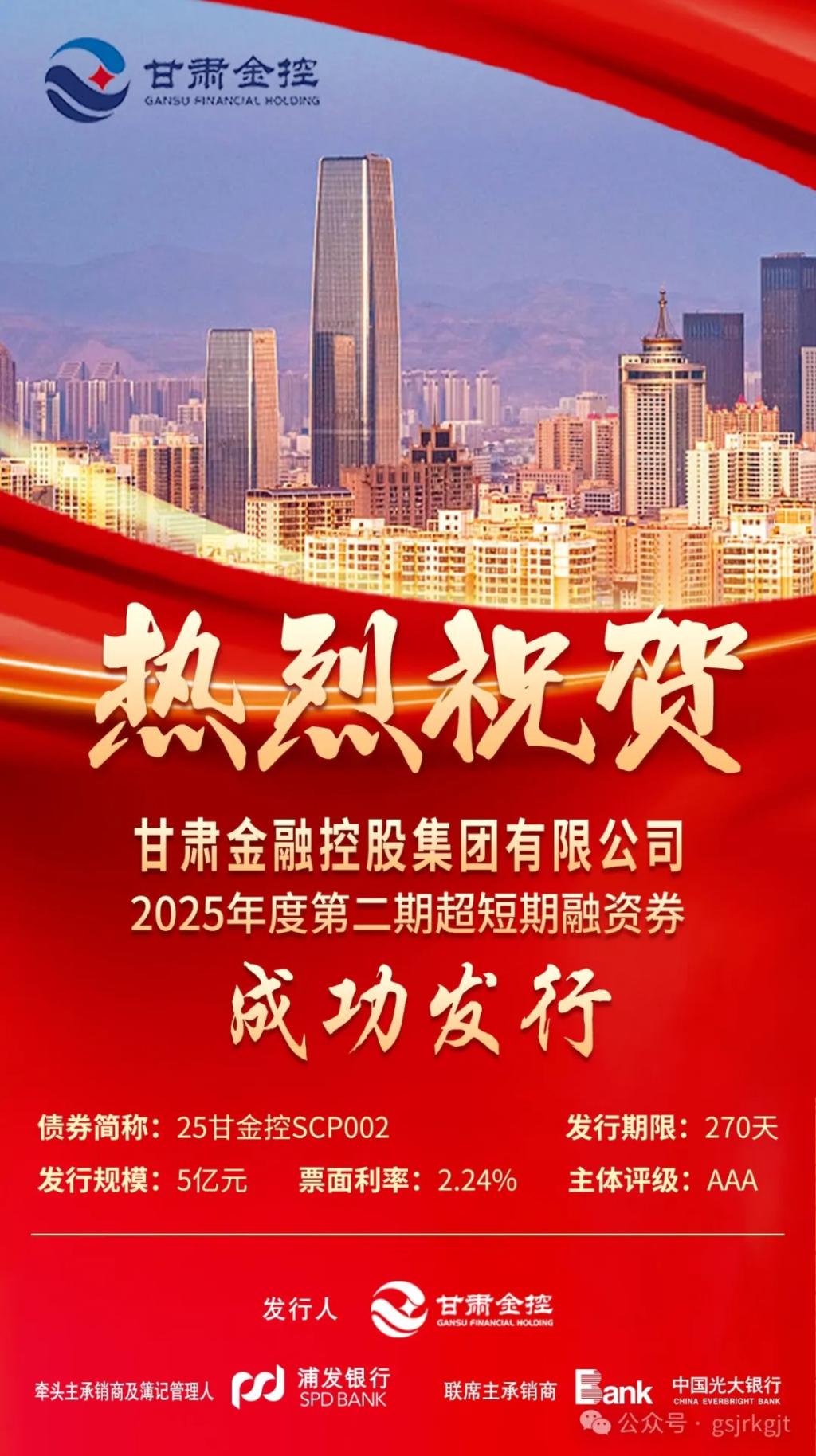 2月24日,甘肅金控集團(tuán)成功發(fā)行2025年度第二期超短期融資券,規(guī)模5億元,期限270天,票面利率2.24%。甘肅金控集團(tuán)始終秉持穩(wěn)健經(jīng)營理念,持續(xù)提升核心競爭力,此次債券的成功發(fā)行,充分體現(xiàn)了市場對集團(tuán)信用資質(zhì)和發(fā)展前景的信心。