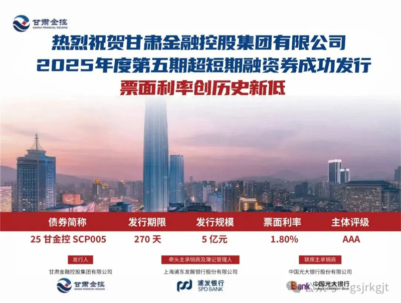 2025年11月17日,甘肅金控集團(tuán)成功發(fā)行2025年度第五期超短期融資券,發(fā)行規(guī)模5億元,期限270天,票面利率1.8%,創(chuàng)下集團(tuán)自開展債券融資業(yè)務(wù)以來所有債券品類中的歷史最低利率紀(jì)錄,融資成本管控成效顯著。此次低利率超短期融資券的成功發(fā)行,體現(xiàn)了資本市場對甘肅金控集團(tuán)經(jīng)營實(shí)力、信用資質(zhì)及發(fā)展前景的高度認(rèn)可,為其后續(xù)支持省內(nèi)實(shí)體經(jīng)濟(jì)發(fā)展、深化金融服務(wù)創(chuàng)新、防范化解金融風(fēng)險(xiǎn)等工作提供更充足的資金保障,助力集團(tuán)在服務(wù)全省經(jīng)濟(jì)社會(huì)高質(zhì)量發(fā)展中發(fā)揮更大作用。