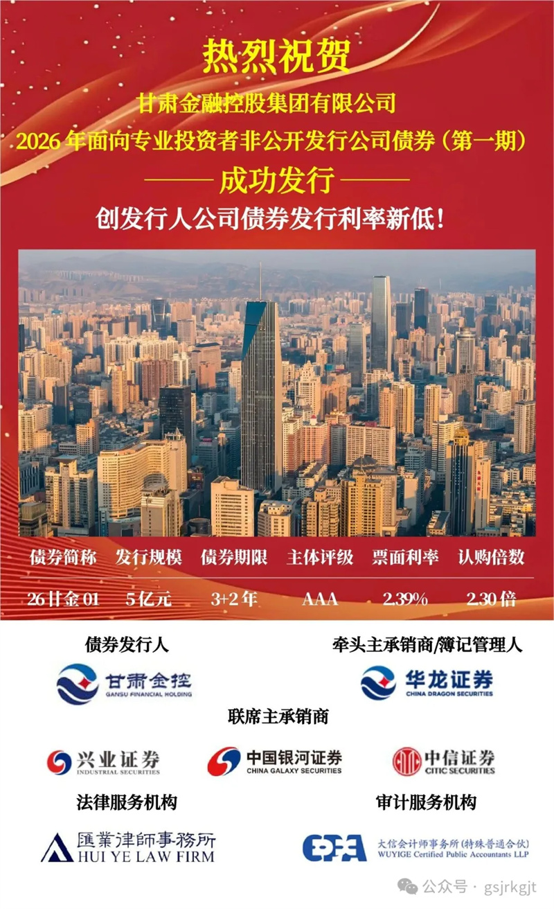 3月11日,甘肅金控集團(tuán)成功發(fā)行2026年第一期非公開公司債券。本期債券發(fā)行規(guī)模5億元,債券期限5(3+2)年期,全場(chǎng)認(rèn)購倍數(shù)2.30倍,發(fā)行票面利率2.39%,刷新甘肅金控集團(tuán)公司債券發(fā)行利率歷史新低。充分彰顯資本市場(chǎng)對(duì)集團(tuán)綜合實(shí)力與發(fā)展前景的高度認(rèn)可,也是集團(tuán)市場(chǎng)化融資能力持續(xù)提升的有力印證。