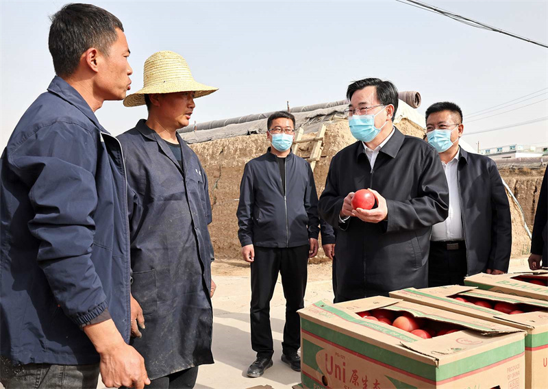 在白銀區(qū)武川鄉(xiāng)紅峴村、靖遠(yuǎn)縣東灣現(xiàn)代農(nóng)業(yè)產(chǎn)業(yè)園,胡昌升走進(jìn)田間地頭、蔬菜大棚,與正在勞作的群眾親切交流,詳細(xì)詢問春耕生產(chǎn)、鄉(xiāng)村振興等情況。他強(qiáng)調(diào),要做好農(nóng)資農(nóng)機(jī)服務(wù)保障,加強(qiáng)農(nóng)業(yè)技術(shù)指導(dǎo),全力抓好春耕生產(chǎn)。要善于挖掘和利用本地優(yōu)勢(shì)資源發(fā)展特色富民產(chǎn)業(yè),培育壯大新型農(nóng)業(yè)經(jīng)營(yíng)主體,提升組織化集約化水平,促進(jìn)農(nóng)業(yè)增產(chǎn)增效、農(nóng)民增收致富。要落實(shí)五級(jí)書記抓鄉(xiāng)村振興要求,發(fā)揮好基層黨組織和黨員干部作用,更好組織群眾、宣傳群眾、凝聚群眾、服務(wù)群眾,緊緊圍繞促進(jìn)農(nóng)民增收這個(gè)中心任務(wù),把黨組織建在產(chǎn)業(yè)鏈上,把黨員聚在產(chǎn)業(yè)鏈上,讓群眾富在產(chǎn)業(yè)鏈上,把黨的組織優(yōu)勢(shì)轉(zhuǎn)化為加快鄉(xiāng)村發(fā)展的實(shí)際成效。