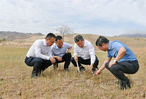 任振鶴先后來到永登縣坪城鄉(xiāng)中塘村和武勝驛鎮(zhèn)富強堡村,走進(jìn)田間地頭,翻開土壤察看苗情墑情,與村民和農(nóng)技人員深入交流,詳細(xì)詢問受旱情況,共同商討研究抗旱減災(zāi)措施。他指出,今年6月以來,我省大部累計降雨量較常年同期偏少三至七成,旱情持續(xù)時間長、發(fā)展快、程度重,給人民生活帶來困難,對部分地區(qū)經(jīng)濟社會發(fā)展、特別是農(nóng)業(yè)生產(chǎn)造成很大威脅。抗旱救災(zāi)、確保民生,已成為目前緊迫而至關(guān)重要的一項工作。