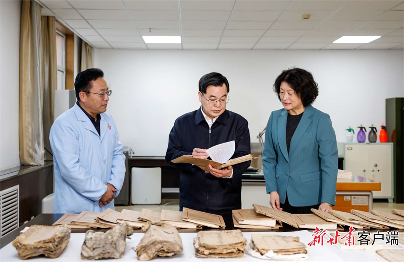 胡昌升強調(diào),省檔案館要加強檔案治理和檔案資源、利用、安全體系建設(shè),加大專業(yè)人才培養(yǎng)力度,創(chuàng)新工作理念方法,不斷提高檔案工作現(xiàn)代化水平。要堅持“應(yīng)歸盡歸、應(yīng)收盡收”,全面做好檔案的收集管理,強化風(fēng)險管控,確保檔案實體安全和信息安全,記錄好、留存好中國式現(xiàn)代化偉大進程的“甘肅記憶”。要加快檔案管理數(shù)字化、智能化建設(shè),深入挖掘檔案資源價值,提升檔案資政服務(wù)、公共服務(wù)、文化教育能力。