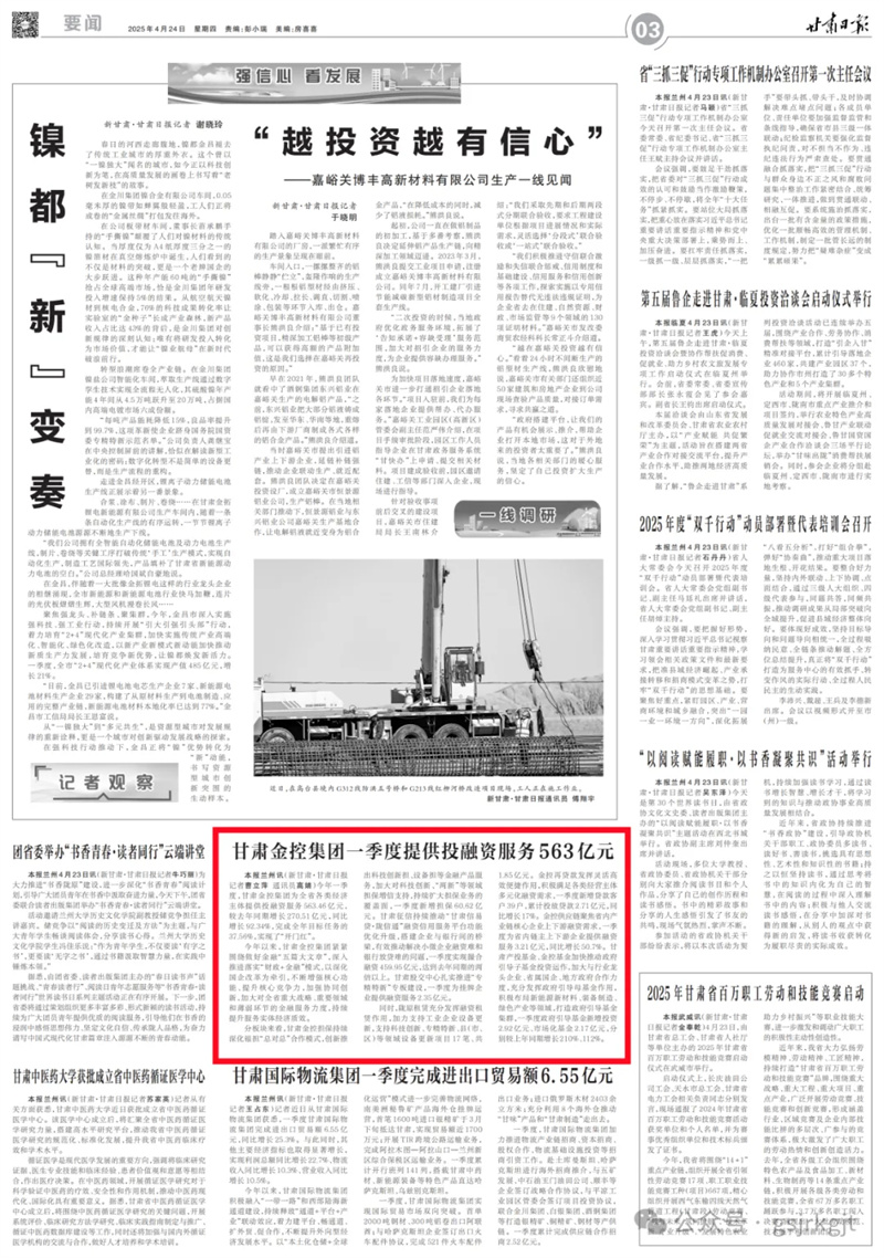 甘肅金控集團(tuán)一季度提供投融資服務(wù)563億元
