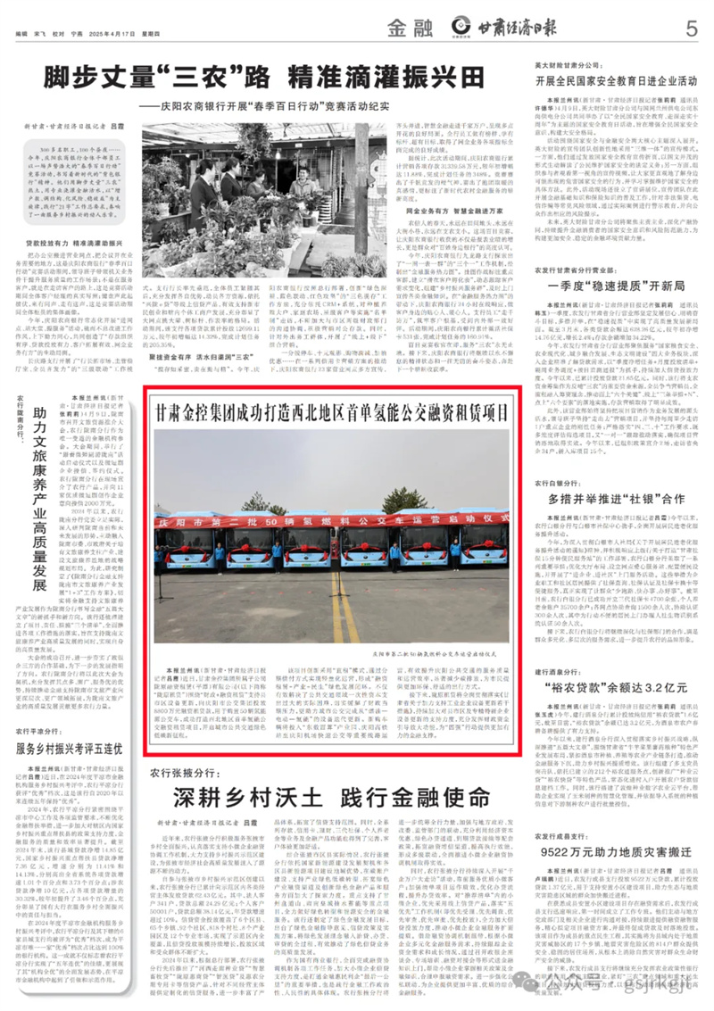 本報蘭州訊(新甘肅·甘肅經(jīng)濟日報記者 呂霞)近日,甘肅金控集團所屬子公司隴原融資租賃(平潭)有限公司(以下簡稱“隴原租賃”)圍繞“財政+融資租賃”支持縣市區(qū)設(shè)備更新,向慶陽市公交集團投放8800萬元融資租賃款,用于購置50輛氫能源公交車,成功打造西北地區(qū)首單氫能公交融資租賃項目,開啟城市公共交通綠色低碳新征程。