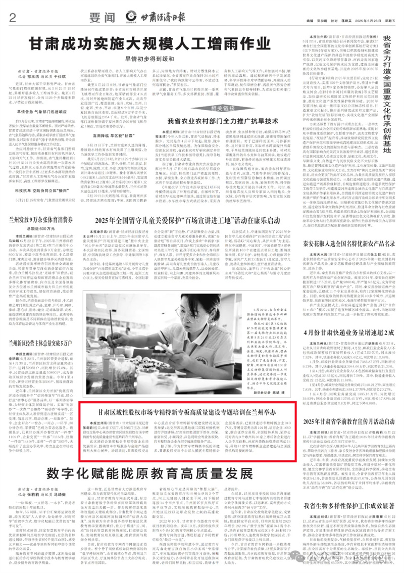 (新甘肅?甘肅經(jīng)濟日報記者張莉莉)近日,由省工信廳、省財政廳主辦,甘肅股權(quán)交易中心承辦的甘肅區(qū)域性股權(quán)市場專精特新專板高質(zhì)量建設(shè)專題培訓(xùn)在蘭州舉辦。