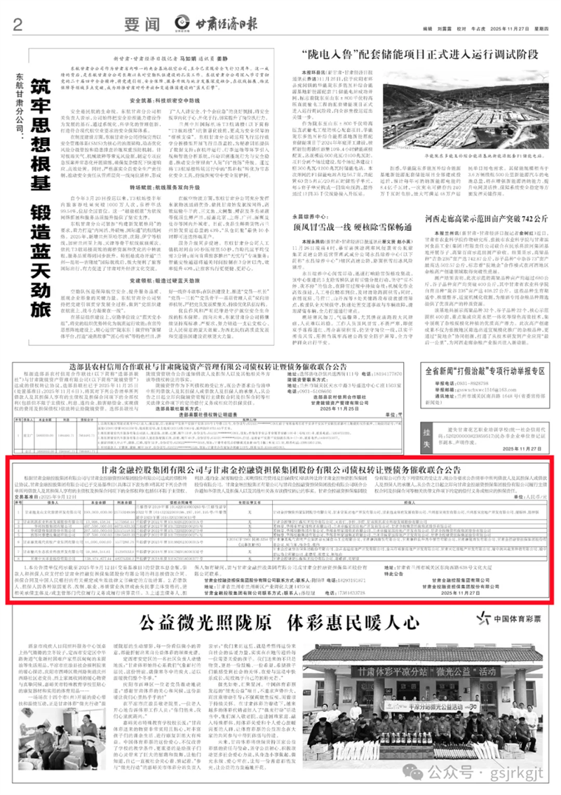 甘肅金融控股集團有限公司與甘肅金控融資擔(dān)保集團股份有限公司債權(quán)轉(zhuǎn)讓暨債務(wù)催收聯(lián)合公告