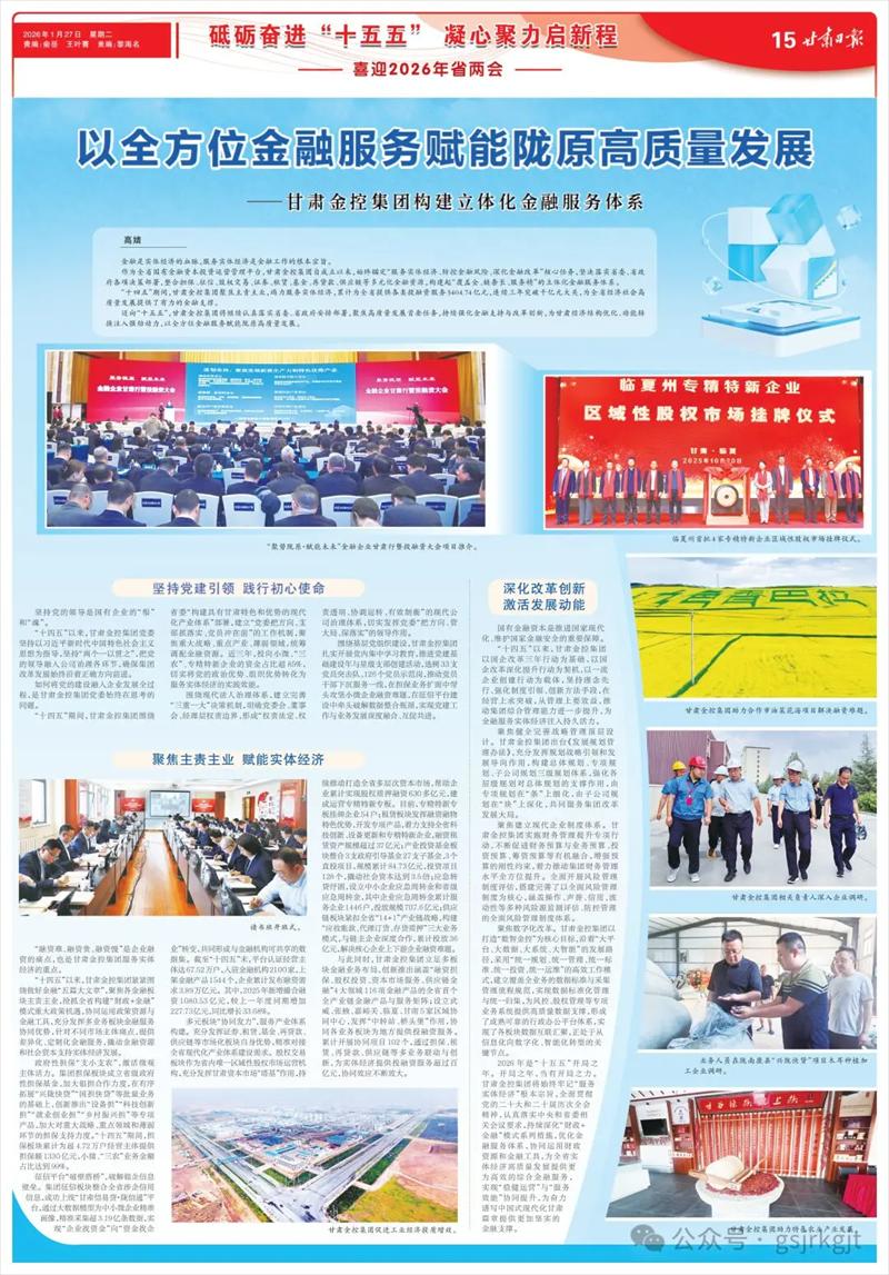 2026年是“十五五”開局之年。開局之年,當(dāng)有開局之力。甘肅金控集團(tuán)將始終牢記“服務(wù)實(shí)體經(jīng)濟(jì)”根本宗旨,全面貫徹黨的二十大和二十屆歷次全會(huì)精神,認(rèn)真落實(shí)中央和省委相關(guān)會(huì)議要求,持續(xù)深化“財(cái)政+金融”模式系列措施,優(yōu)化金融服務(wù)體系,協(xié)同運(yùn)用財(cái)政資源和金融工具,為全省實(shí)體經(jīng)濟(jì)高質(zhì)量發(fā)展提供更為高效的綜合金融服務(wù),實(shí)現(xiàn)“穩(wěn)健運(yùn)營(yíng)”與“服務(wù)效能”協(xié)同提升,為奮力譜寫中國(guó)式現(xiàn)代化甘肅篇章提供更加堅(jiān)實(shí)的金融支撐。(高婧)