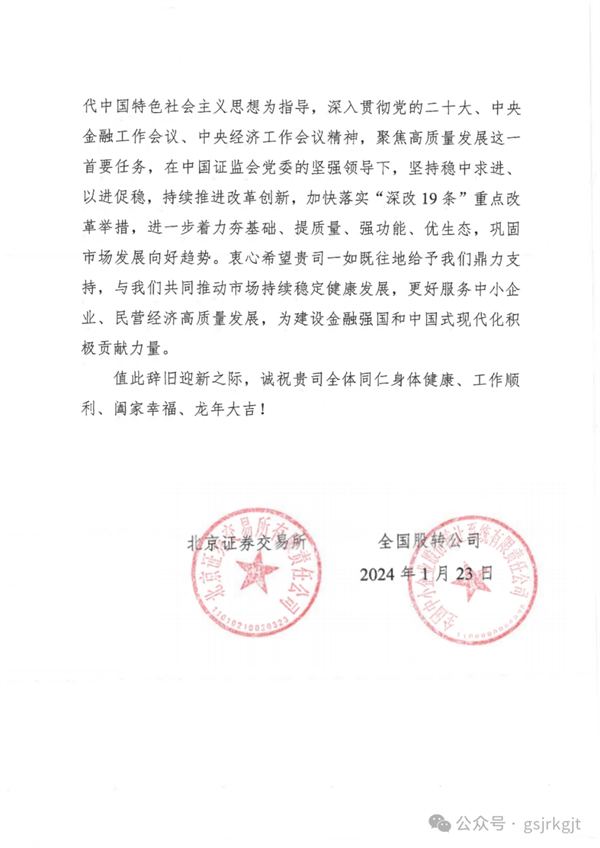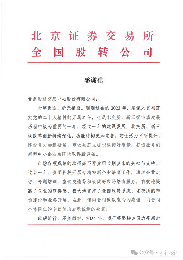 新春到來之際,甘肅股權(quán)交易中心喜獲北交所、全國股轉(zhuǎn)公司發(fā)來的感謝信。2023年,是甘肅股權(quán)交易中心與北交所、全國股轉(zhuǎn)公司深化合作的一年,“北交所、全國股轉(zhuǎn)系統(tǒng)甘肅服務(wù)基地”揭牌、與全國股轉(zhuǎn)公司簽訂《監(jiān)管合作備忘錄》啟動新三板掛牌“綠色通道”便利機制,聯(lián)合開展北交所“三服務(wù)”甘肅行活動,走訪、座談、一對一診斷、培訓企業(yè)百余家,基本實現(xiàn)省內(nèi)市州及蘭州新區(qū)全覆蓋,北交所改革東風吹向隴原大地,為甘肅資本市場高質(zhì)量發(fā)展帶來了新的歷史機遇。